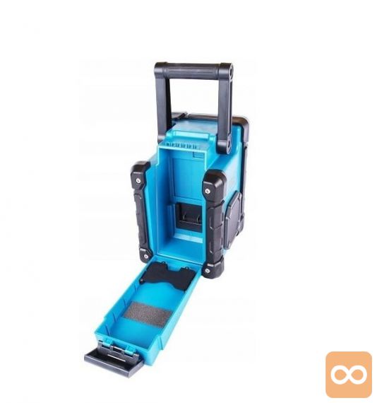 Akumulatorski gradbeni radio ima 1 USB priključek z napetostjo 5V/1A, s katerim lahko polnite svoj pametni telefon. Ohišje radia ima poseben, vodoodporen žep za mobilno napravo . Glasbo je mogoče prenašati tudi prek vtičnice AUX . Zložljiva antena omogoča enostaven transport in omogoča sprejem FM radijskih postaj v območju 87,5MHz-108MHz