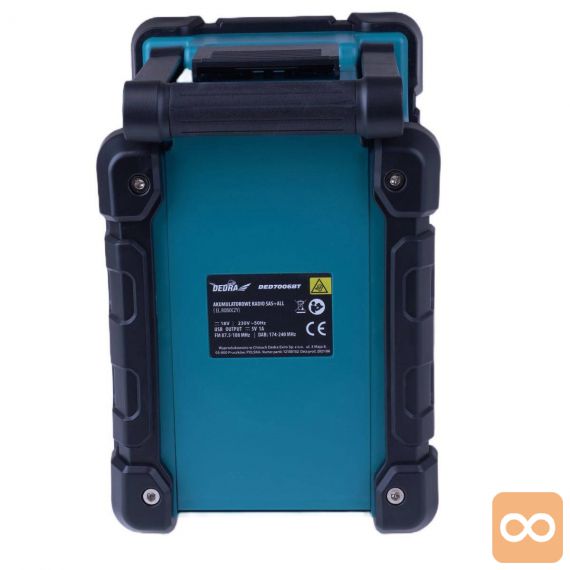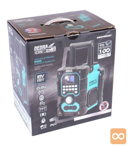 Izdelek je namenjen vsem tistim, ki imate električna orodja z enotnim baterijskim sistemom SAS+ALL in tistim, ki svoje orodje šele začenjate sestavljati. Zahvaljujoč napajanju iz iste baterije vam radio ne bo uporaben le, ko boste pri delu uživali ob svoji najljubši glasbi. Po potrebi lahko njegovo baterijo uporabljate za napajanje električnega orodja, medtem ko baterijo polnite v super hitrem polnilniku DED7039, medtem pa radio uporabljate tako, da ga napajate iz standardne vtičnice (vhodni tok 230V, izhodni tok 9V) .