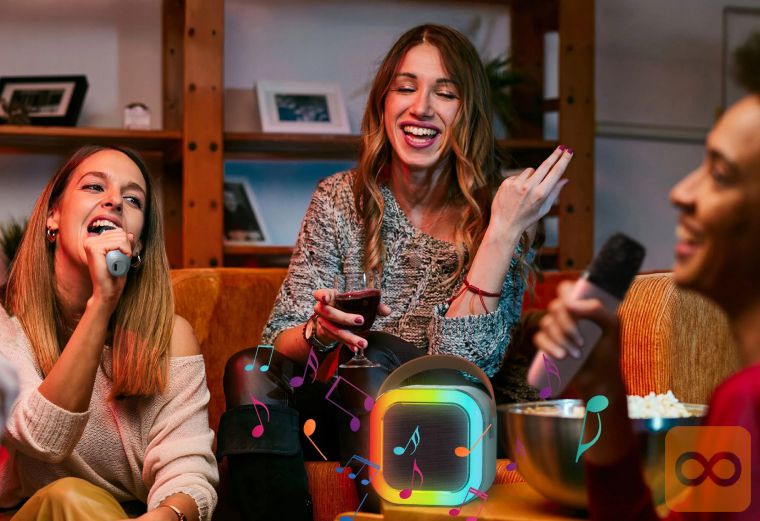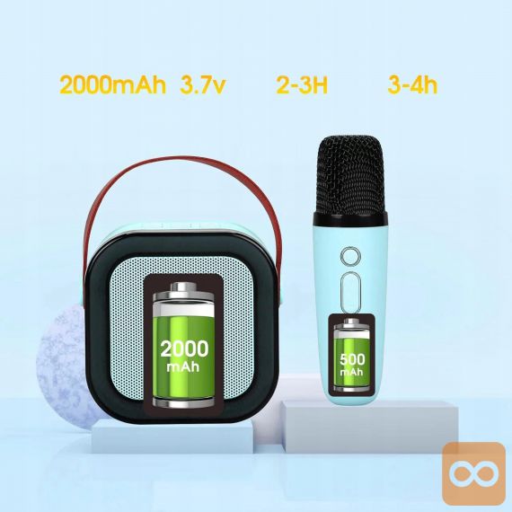 Zabava, kjerkoli želite! S tem zmogljivim in prenosnim karaoke zvočnikom z vgrajeno baterijo 1200 mAh, boste vi in vaši prijatelji vedno pripravljeni na petje in ples. Zvočnik podpira najnovejšo Bluetooth 5.3 tehnologijo, priložena pa sta dva brezžična mikrofona, ki omogočata popoln duet. LED RGB osvetlitev doda posebno vzdušje, zvočnik pa je idealen za rojstnodnevne zabave, piknike, kampiranje ali domače karaoke večere.