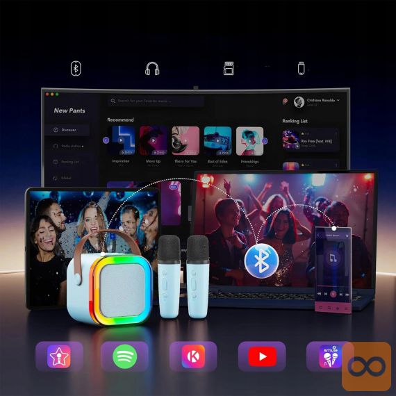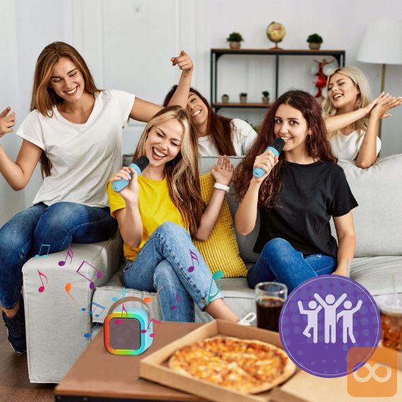 Komplet za karaoke je sestavljen iz kompaktnega Bluetooth zvočnika in dveh brezžičnih mikrofonov, kot nalašč za zabavo doma, na zabavah ali družabnih srečanjih. Zvočnik ima močan in čist zvok, njegova prenosljivost pa vam omogoča, da ga enostavno postavite kamor koli. Zahvaljujoč Bluetooth povezljivosti ga lahko hitro in enostavno povežete s telefonom, tablico ali drugo napravo.