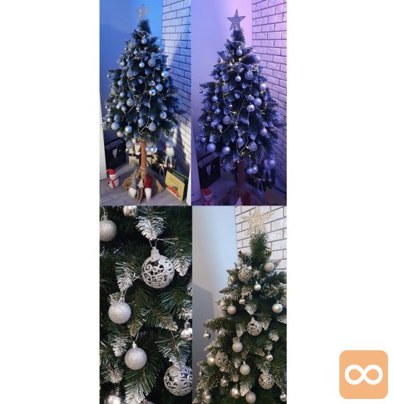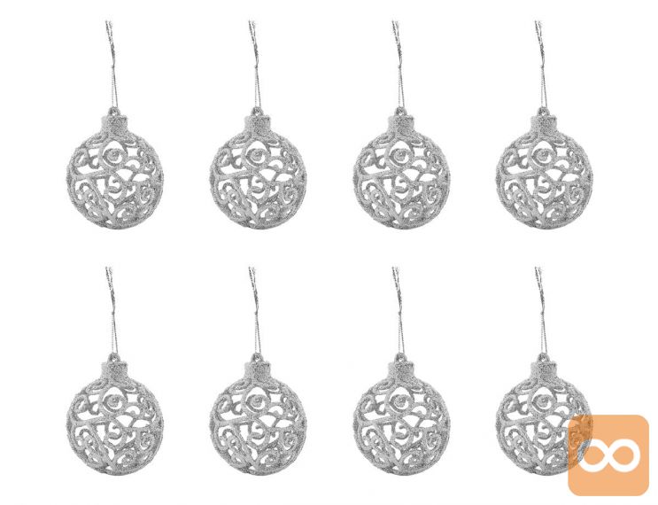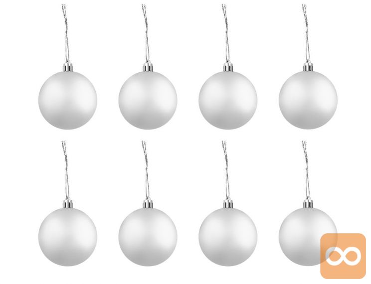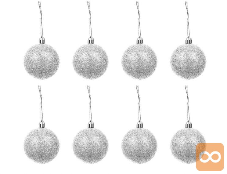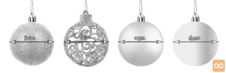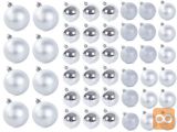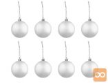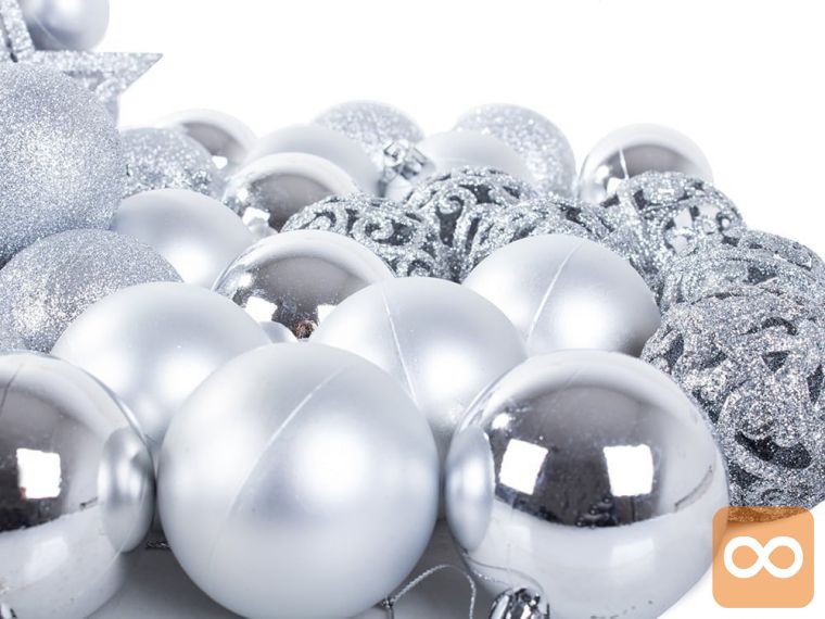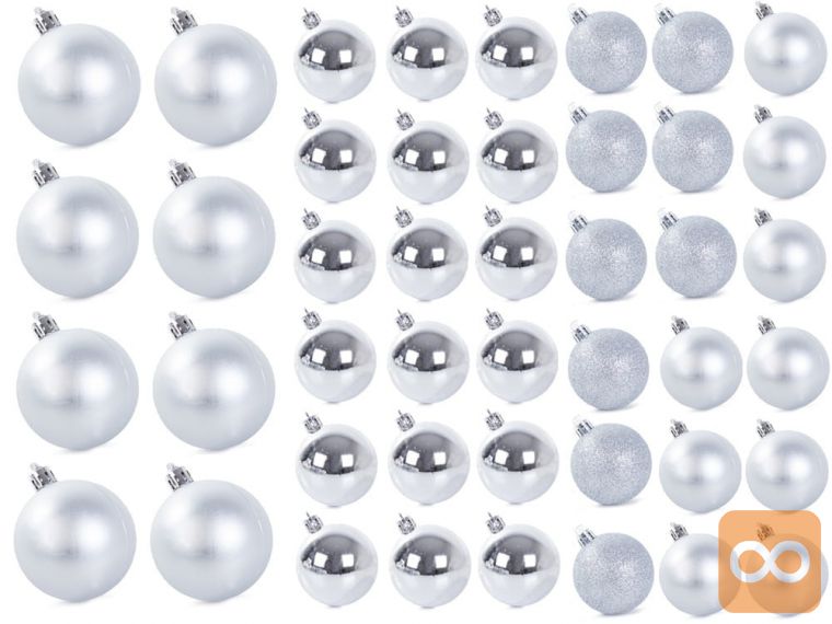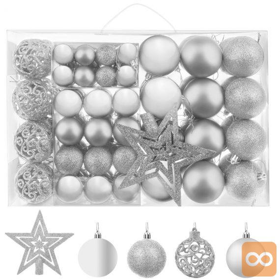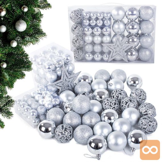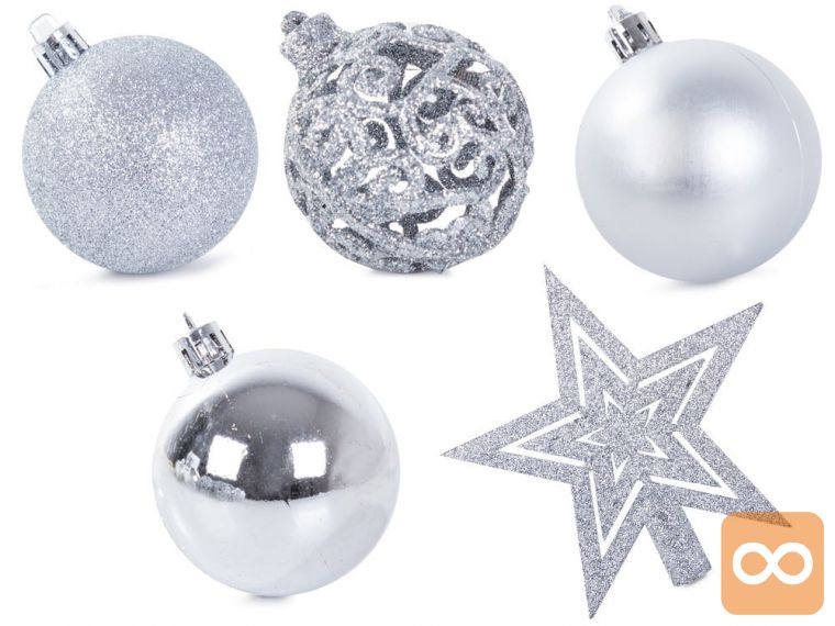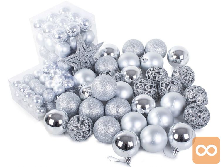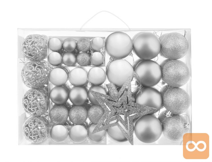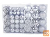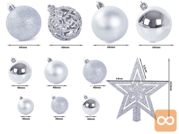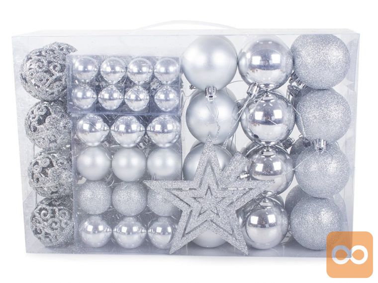 - SPECIFIKACIJA – barva: srebrna; material: plastika; število kosov v kompletu: 100 + zvezdica; vrste kroglic: mat, bleščeče, sijoče, odprte; premeri kroglic: 6/4/3 cm; mere zvezdice (dolžina / širina): 12/14 cm; teža: 0,7 kg; teža v paketu: 0,9 kg.
