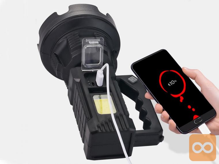 Poleg tega je ta svetilka opremljena s funkcijo USB powerbank, kar pomeni, da lahko med uporabo polnite svoje elektronske naprave, kot so pametni telefoni, tablični računalniki in druge naprave, ki se polnijo preko USB priključka. To je izjemno priročno, še posebej, če se znajdete na prostem ali v situaciji, kjer ni na voljo električne energije.