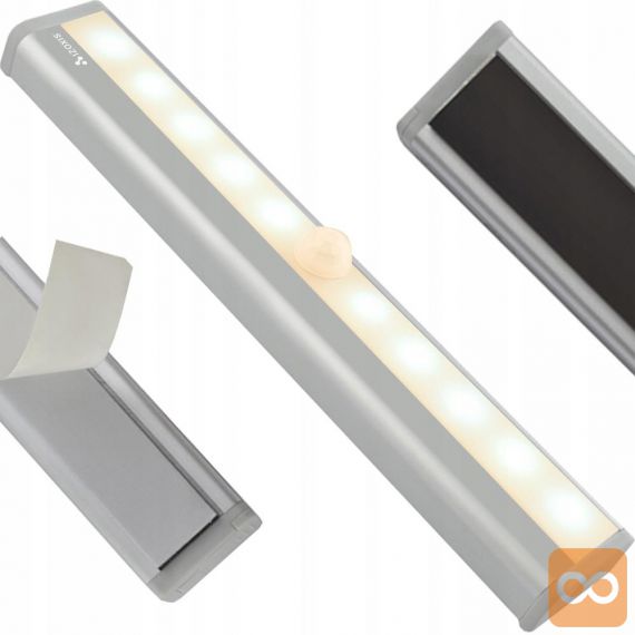 - SPECIFIKACIJA: ohišje: aluminij + plastika; barva osvetlitve: topla bela; število LED: 10; svetlobna moč: 80 lumnov; moč žarnice: 1W; napajanje: 4 x AAA baterije (niso priložene); napetost: DC 3-6V; induktivni senzor: 3-5m; kot: <110°; čas osvetlitve po zaznavi gibanja: ~15 sekund; velikosti (širina/dolžina/višina): 3x19x1,7cm; teža: 63 g