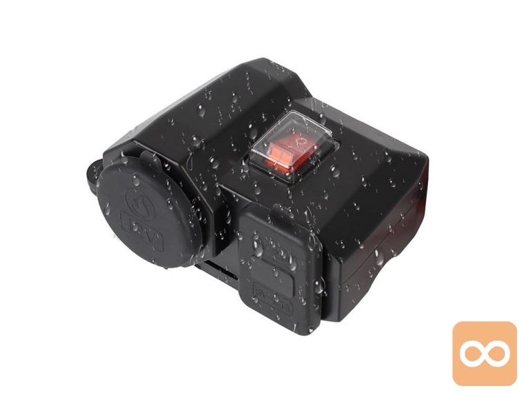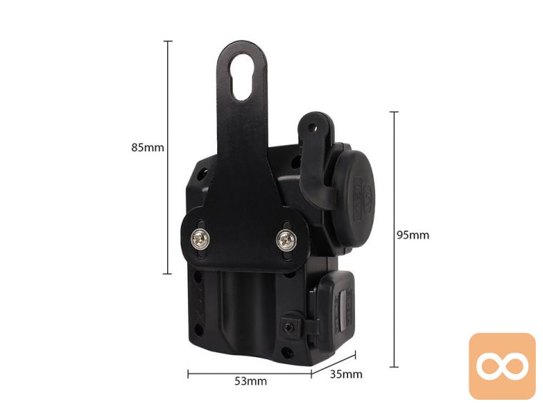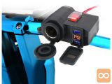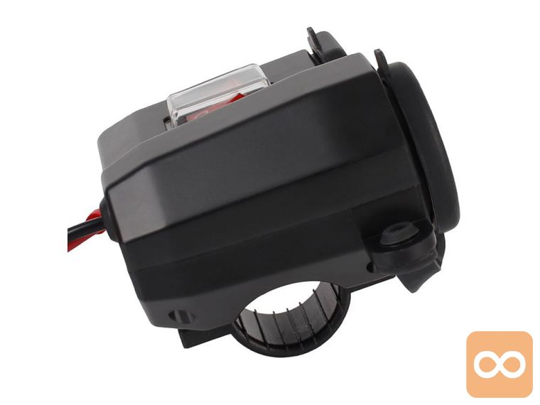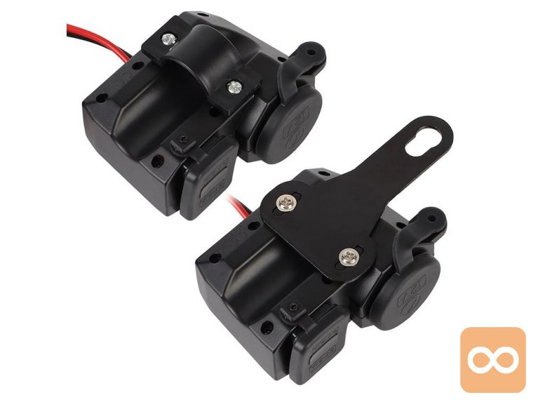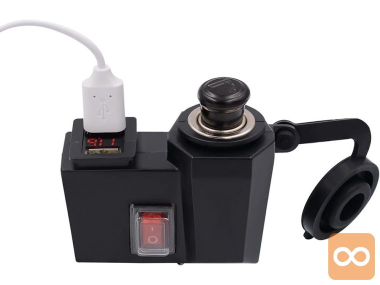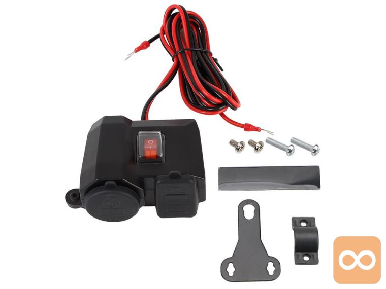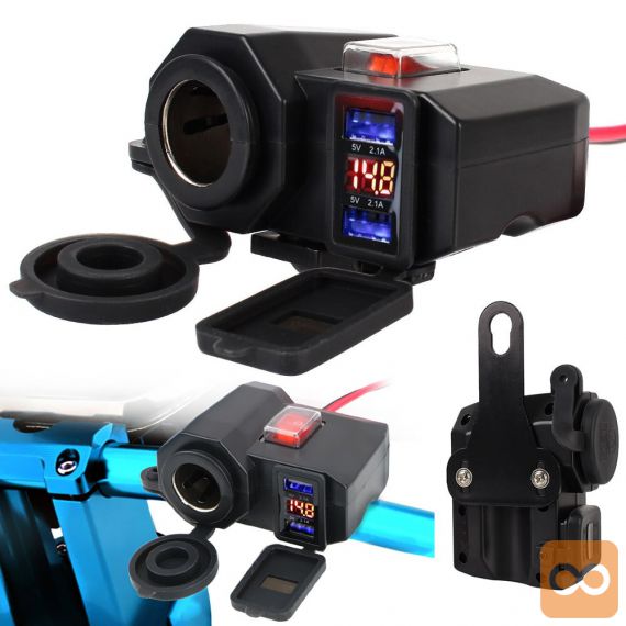 Vodoodporna vtičnica za cigaretni vžigalnik za motocikel, skuter, štirikolesnik. Opremljen je z voltmetrom, ki prikazuje polnilno napetost baterije. Poleg tega ima dva priključka USB 2.1A. Vtičnica ima dva gumijasta vtiča, ki jo ščitita pred vremenskimi vplivi.