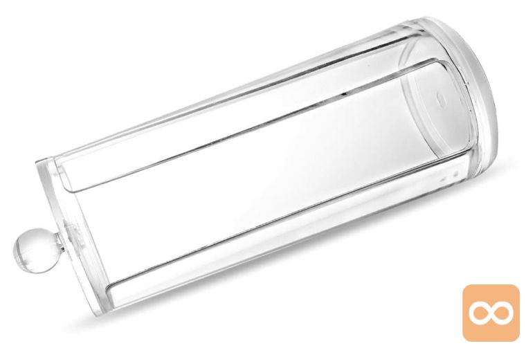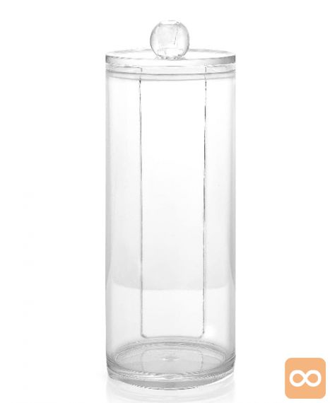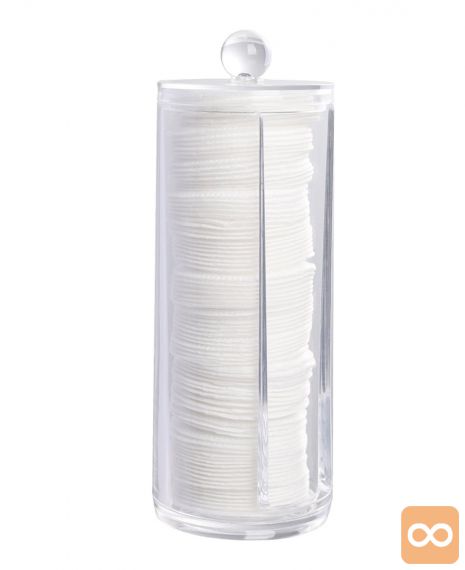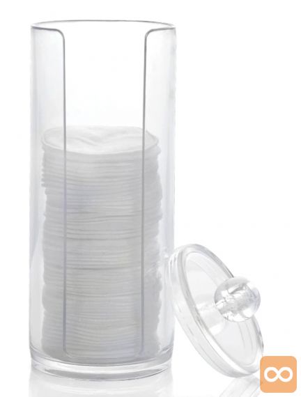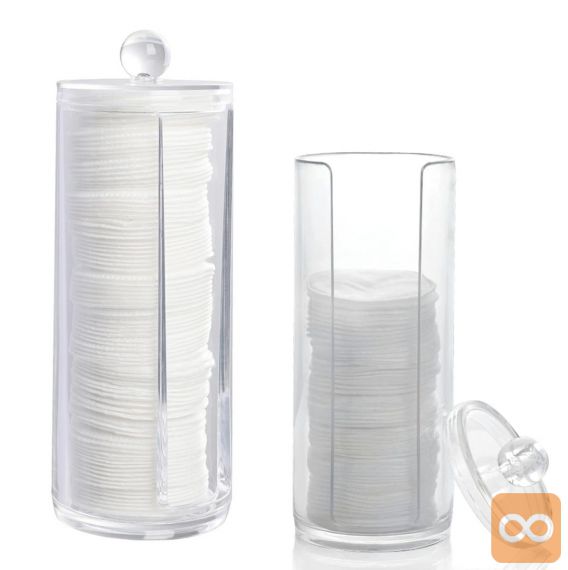 Elegantna in izjemno praktična posodica za vatne blazinice in vatne blazinice. Nepogrešljiv v vsaki kopalnici in toaletni mizici. Izdelan iz trpežne, prozorne plastike. Organizator ima odprto režo, ki olajša zbiranje kosmičev. V kompletu je tudi snemljiv zgornji pokrov z ročajem. Umirjen dizajn in preglednost zagotavljata, da se posoda zlije z ozadjem.