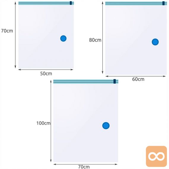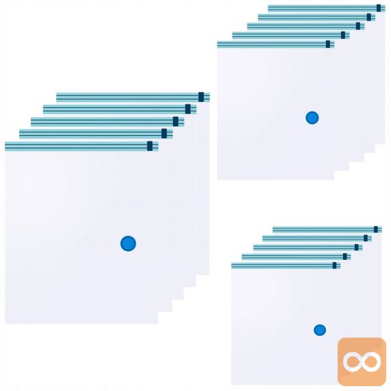 • SPECIFIKACIJA – barva: prozorna / modra; mere: (širina/dolžina) 50x70cm – 5 kosov; (širina / dolžina) 60x80cm – 5 kosov; (širina / dolžina) 70x100cm – 5 kosov; teža: 1,242 kg; teža v paketu 1.442 kg.