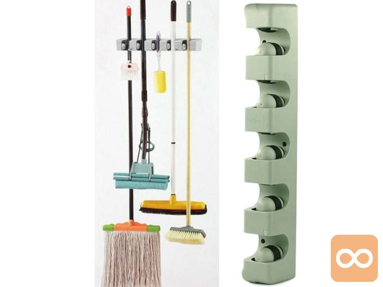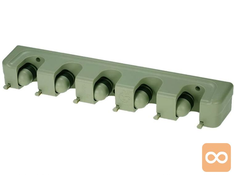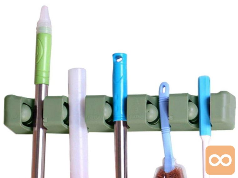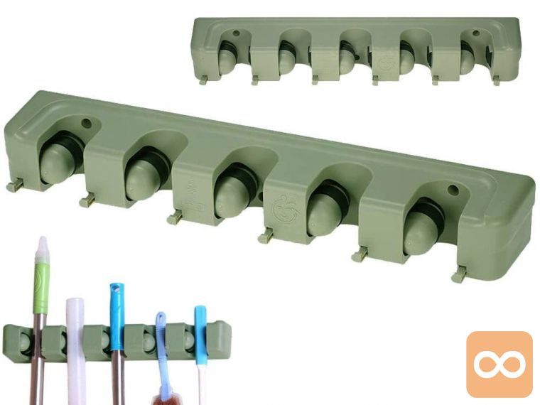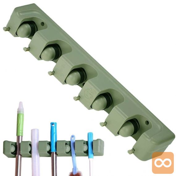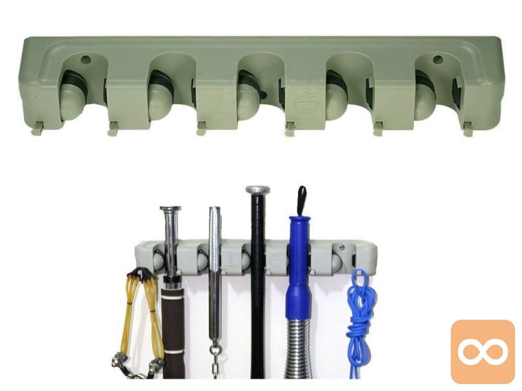 Obešalnik / stensko držalo za orodje in gospodinjske pripomočke. Izdelek odlično organizira prostor in omogoča priročno shranjevanje najpogosteje uporabljenega orodja, kot so metle, krpe, grablje, lopate itd.