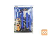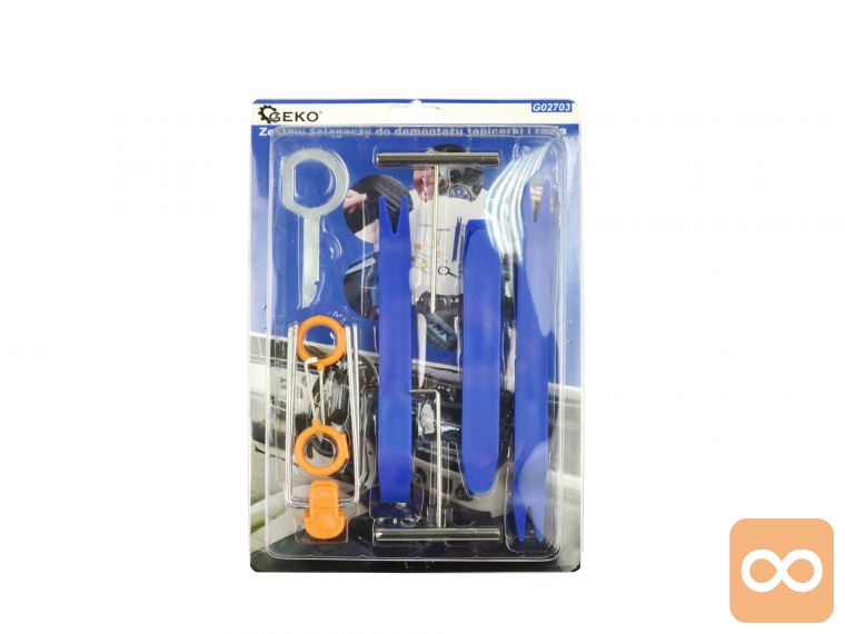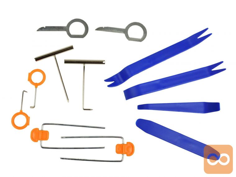 Komplet orodij za demontažo radia in oblazinjenja. Odlično se bo obnesel v vsaki avtomobilski delavnici, še posebej v delavnicah, ki se ukvarjajo z avtomobilsko elektroniko.