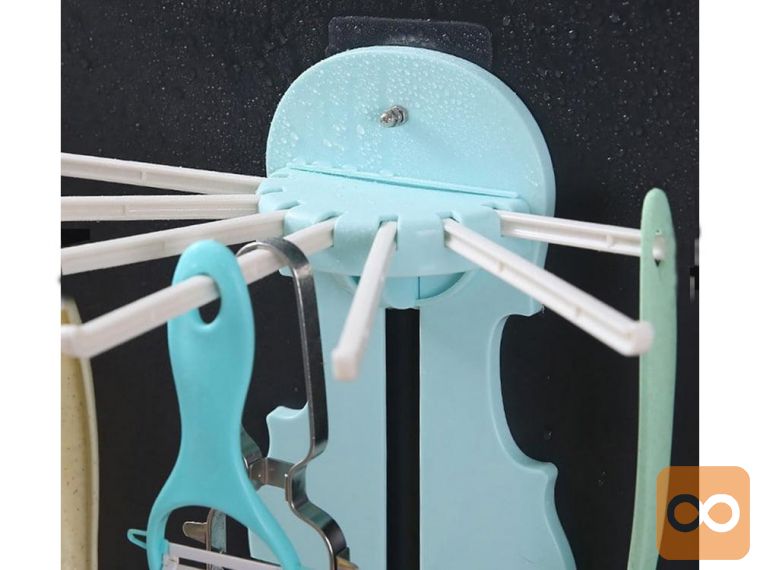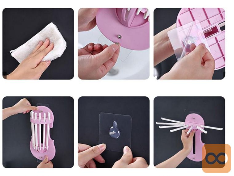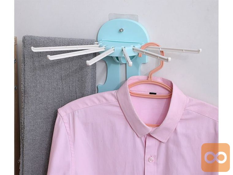 Obešalo lahko pritrdite z dvema lepilnima blazinicama , opremljenima z vijaki za pritrditev obešala. Opremljen je s 7 dolgimi rokami . Lahko se hitro zloži, tako da ne zavzema prostora, ko ni v uporabi.