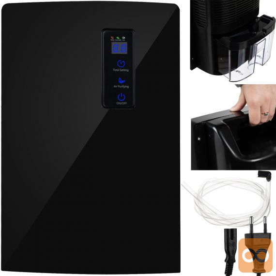 - SPECIFIKACIJA – črna barva; material: kovina / plastika; zaslon: LCD, prikazuje: temperaturo in vlažnost; časovnik: 24 – urni; 2v1 čiščenje in razvlaževanje zraka; zmožnost dela pri temperaturah pod 0: da do -5oC; funkcija samodejnega odmrzovanja; velikost sobe: do 30m2; čiščenje: uporablja UV svetlobo in tehnologijo čiščenja s titanovim dioksidom (TiO2) za razgradnjo onesnaževal iz zraka; zmogljivost razvlaževanja: do 700 ml na dan pri 25oC in 85% vlažnosti; prostornina rezervoarja za vodo: 1500 ml; možnost odvajanja vode skozi cev: da; napetost: 220-240V; moč: 65W; samodejni izklop po polnjenju rezervoarja: da; način delovanja: po Peltierjevem sistemu; primeren za: dom, pisarno itd.; dimenzije: 36 x 24 x 13 cm; dolžina cevi: 100 cm; dolžina kabla: 1,2 m; teža: 2 kg; teža v paketu: 2,372 kg.