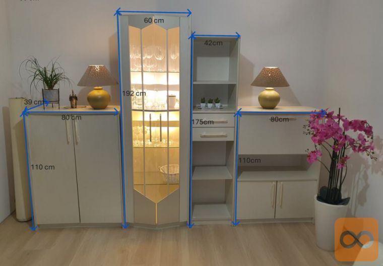 Odlično ohranjen dnevni regal Monaco bele barve. Globina vseh elementov je 39 cm. Po želji lahko brezplačno dodam jedilno mi...