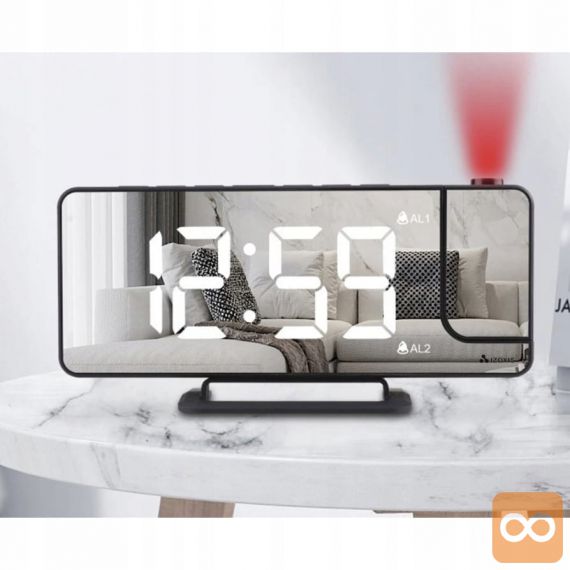 - SPECIFIKACIJA – material: ABS; črna barva; barva zaslona projektorja: rdeča; barva prikaza ure: bela; format prikaza časa: 12h; osvetlitev ozadja: LED; nelomljivo ogledalo: da; mere: 18,5 x 7,5 x 4 cm; teža: 0,144 kg