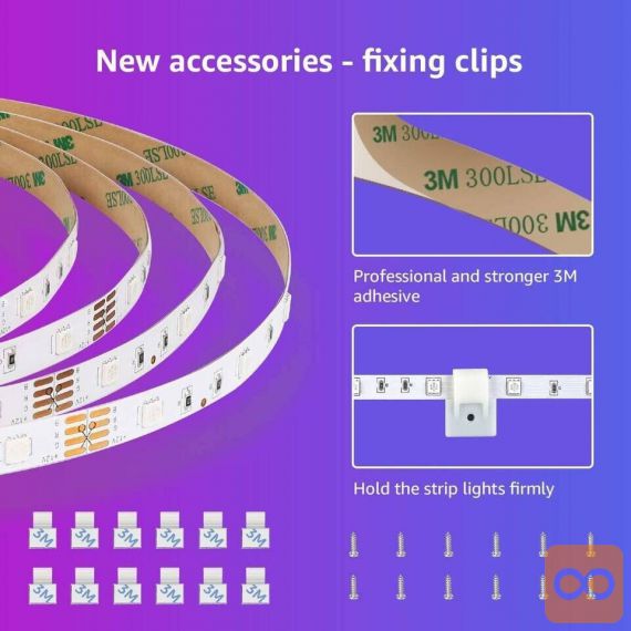 • Močno 3M lepilo: samolepilni LED trak lahko nalepite na suho, ravno površino. Zdaj smo dodali dodatne nosilce za pritrditev. Naj vas ne skrbi, da bo trak odpadel.