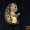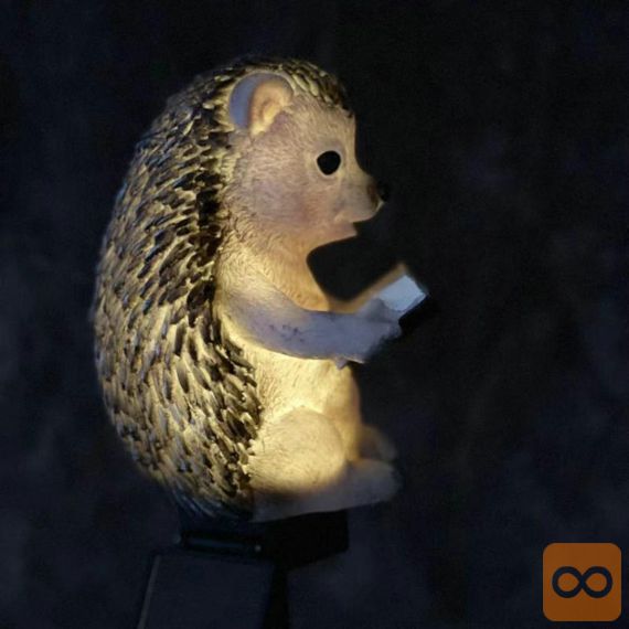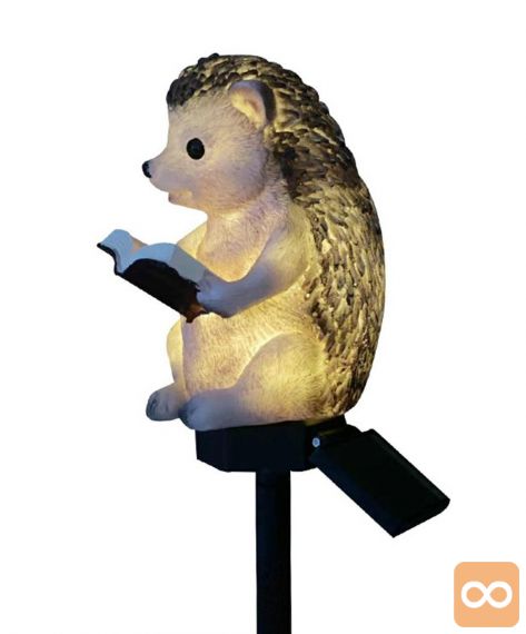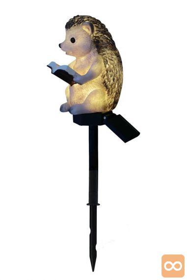 Nenavadna, solarna LED vrtna svetilka v obliki ježka, ki bere knjigo. Odličen dekorativni element. Svetilka se napaja s sončno energijo, ki s pomočjo solarne plošče polni vgrajeno polnilno baterijo. Naprava se samodejno zažene, ko se zmrači (opremljena je s senzorjem mraka), polna baterija pa zadošča za do 8 ur neprekinjenega delovanja. Svetilka ima LED, ki oddaja belo svetlobo. Močna konica omogoča zanesljivo in hitro namestitev svetilke v tla, vodotesno ohišje pa zagotavlja nemoteno uporabo ne glede na vremenske razmere.