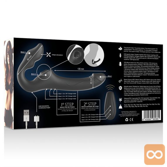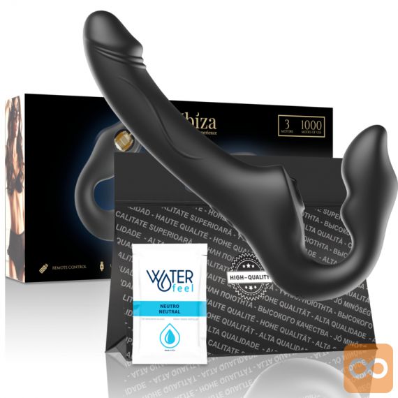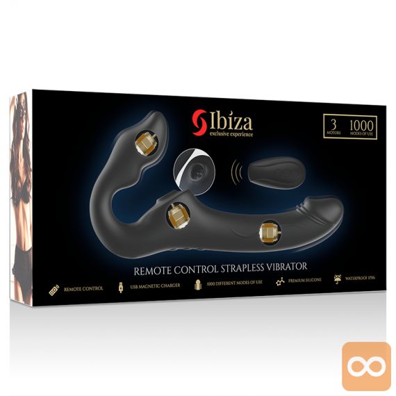 Silikonski strap-on vibrator na daljinsko upravljanje IBIZA s stimulatorjem G točke, klitorisa in nožnice vas pripravi na čisti užitek med spolnim odnosom. Z elegantnim črno-zlatim zaključkom se je popolnoma nemogoče upreti skušnjavi. Poganjajo ga 3 močni motorji ki vam omogočajo do 1.000 različnih načinov vibriranja. Njegova posebnost je, da ga lahko nosite samostojno, brez uporabe strap-on pasov. To storite tako, da vstavite krajši, ukrivljen konec, ki ne zagotavlja le trdnega oprijema, temveč tudi intenzivno masažo G-točke. Medtem ko penetrirate vašega partnerja, vam vibrator obenem stimulira G točko in klitoris ter vam tako nudi maksimalno zabavo in eksplozivne občutke.
