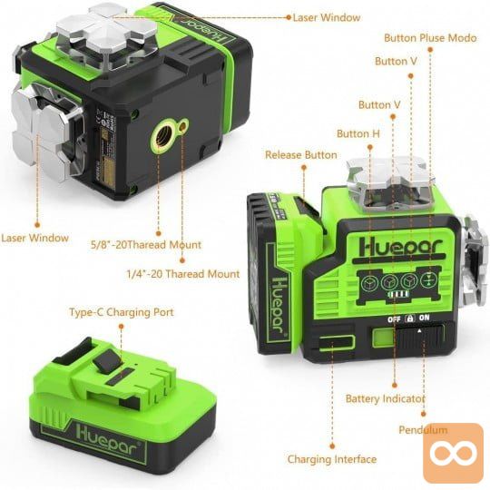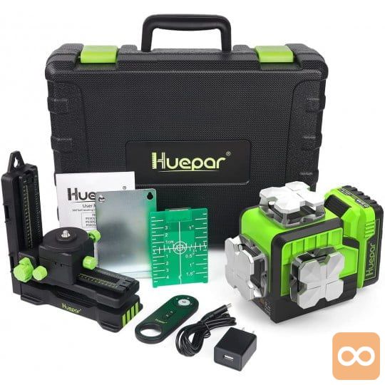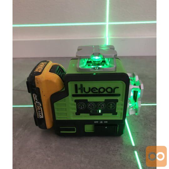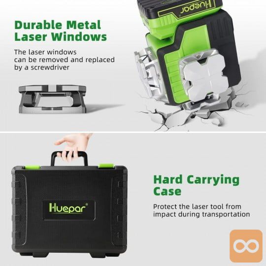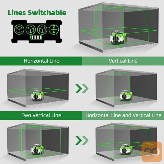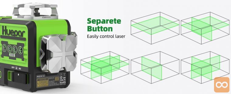 Laserski nivo Huepar ima eno vodoravno 360° ravnino, dve navpični 360° ravnini, 12 laserskih linij, ki lahko pokrijejo tla, stene in strop po vsem prostoru. Vodoravne in navpične črte, ki se križajo pod kotom 90°, vam pomagajo hitro vizualizirati in dokončati kvadratno postavitev. Vsak gumb na tem laserskem nivoju ustreza eni sami laserski črti, preprosto lahko izberete vklop/izklop katere koli laserske črte.