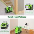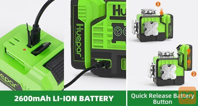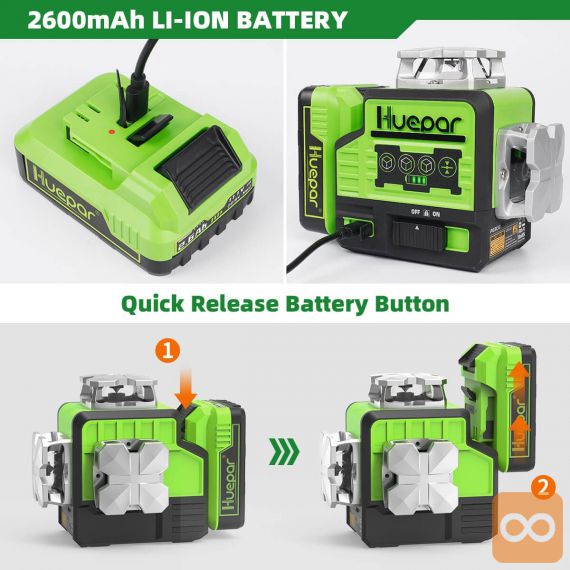Li-ionsko baterijo je mogoče hitro sprostiti, namestitev pa je zelo enostavna za uporabo. Li-ionsko baterijo je mogoče polniti ločeno, štirje indikatorji moči na bateriji pa uporabnikom omogočajo, da poznajo stanje napolnjenosti. Ko vzamete baterijo, lahko na delovnem mestu uporabite križni laserski nivo, tako da ga priključite neposredno. S polnilnim priključkom Type-C lahko lasersko libelo polnite tudi s telefonom, prenosnikom, napajalnikom, avtomobilskim polnilnikom itd.