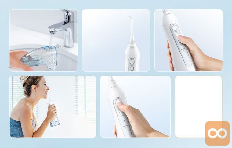 Irrigator FairyWill 5020E je neverjetno lahek in prenosljiv. Zahvaljujoč ergonomski obliki se popolnoma prilega vaši roki in zagotavlja udobje. Če želite, ga lahko brez težav vzamete s seboj na dopust – ne bo zavzel preveč prostora v torbi ali kovčku. Prav tako ne bo veliko breme.