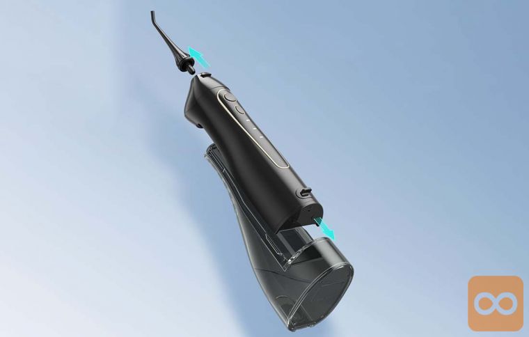 Irigator je opremljen z velikim 300 ml rezervoarjem za vodo. To je dovolj, da si lahko temeljito umijete zobe, ne da bi ga morali ponovno napolniti. Po potrebi ga lahko enostavno očistite in tako preprečite razmnoževanje bakterij. Poleg tega zahvaljujoč izboljšani zasnovi rezervoar ne pušča, polnjenje z vodo pa je otročje lahko in hitro.