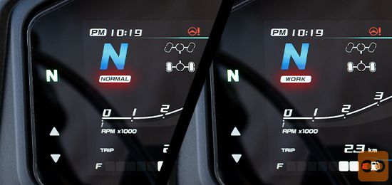 Barvni 7-palčni TFT zaslon z avtomatskim preklapljanjem med dnevnim in nočnim načinom, funkcije: merilnik hitrosti, tahometer, merilnik goriva, ura, merilnik temperature hladilne tekočine, dnevni in skupni števec kilometrov, indikatorji prestave, vožnje in izbranega načina vožnje, opozorilne lučke