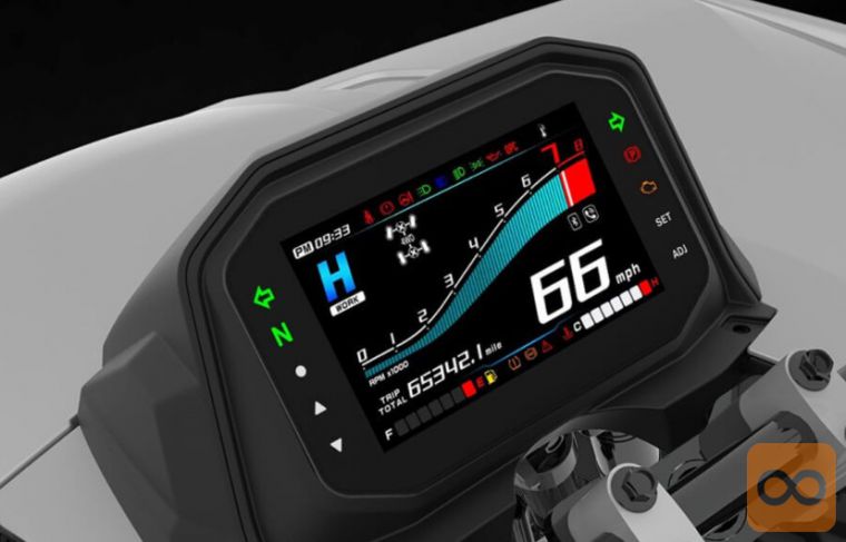 Barvni 7-palčni TFT zaslon z avtomatskim preklapljanjem med dnevnim in nočnim načinom, funkcije: merilnik hitrosti, tahometer, merilnik goriva, ura, merilnik temperature hladilne tekočine, dnevni in skupni števec kilometrov, indikatorji prestave, vožnje in izbranega načina vožnje, opozorilne lučke