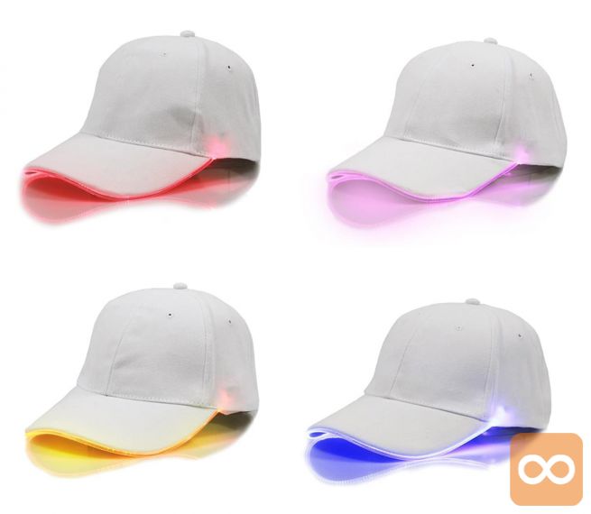 Kapa s šiltom / baseball kapa opremljena z RGB LED diodami, ki oddajajo barvno svetlobo. Odličen pripomoček, ki olajša večerni sprehod brez opravka s klasično svetilko. Dobra in energijsko varčna alternativa težkim čelnim svetilkam ali klasičnim virom svetlobe!