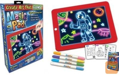 ECO LED grafična tablica za risanje + neon flomastri MAGIC PAD je odličen pripomoček za vse, ki radi rišejo in ustvarjajo. Tablica je opmljena z LED osvetlitvijo, ki omogoča enostavno risanjeudi v temnih prostorih. Neon flomastri pa omogočajo ustvarjanje pisanih in živahnih risb.
