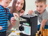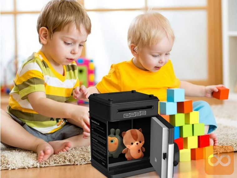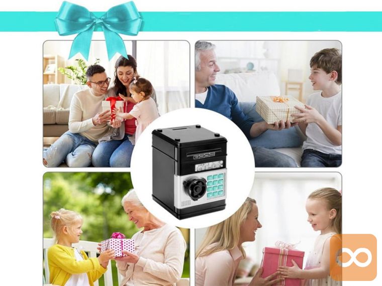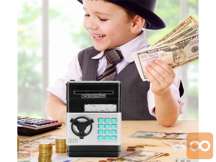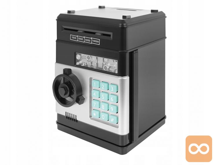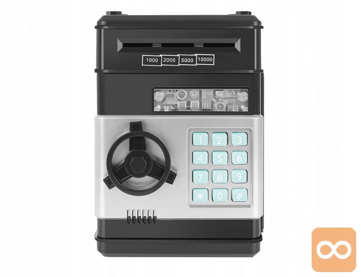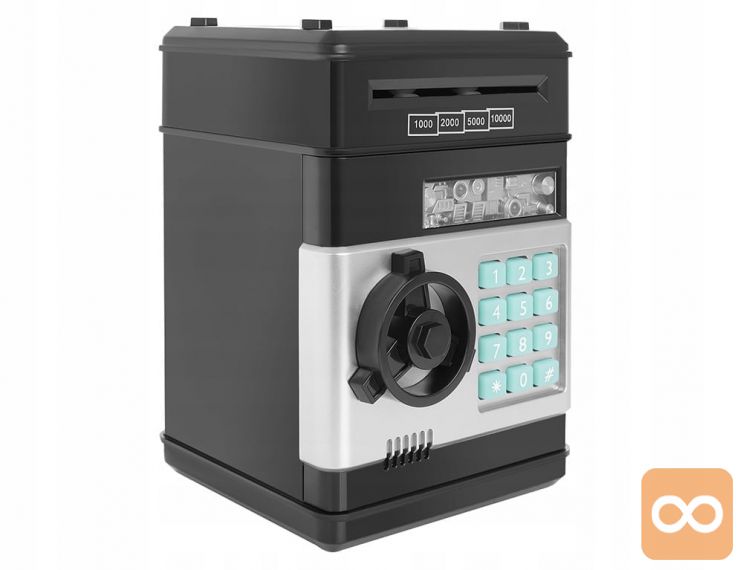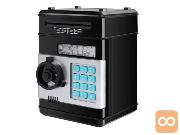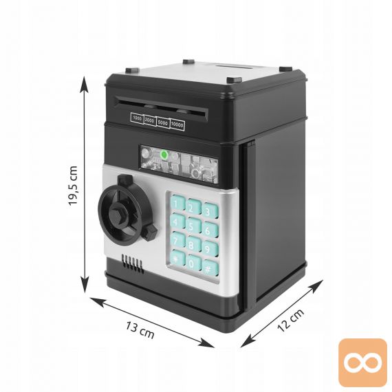 • SPECIFIKACIJA – vrata se odprejo po vnosu 4-mestne PIN kode; možnost vnosa lastnega gesla; za bankovce in kovance; starost otroka 6+; sposobnost spreminjanja zvokov v glas; po 20 sekundah vas sef opomni na odprta vrata; mere (višina/širina/globina): 19,5/13/12 cm; teža: 0,55 kg