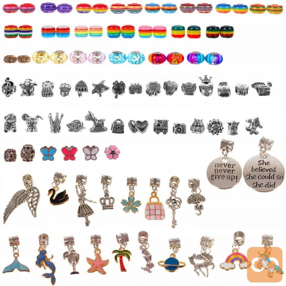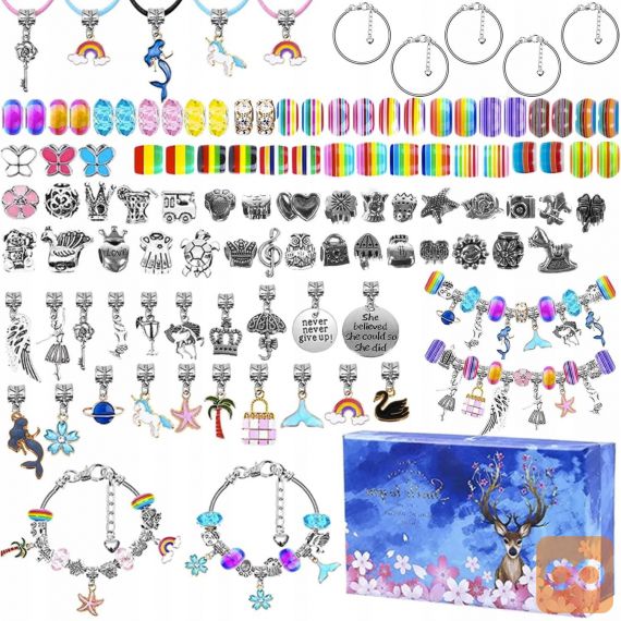 - VELIK SET – Komplet 107 elementov bo otroku omogočil ustvarjanje pravljično pisanih zapestnic in verižic v različnih oblikah in z različnimi motivi. V kompletu je bilo priloženih 5 verižic in 5 zapestnic na katere nataknete perle in obeske .