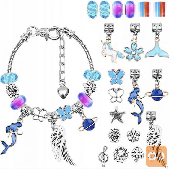 - KOMPLET NAKITA – ta unikaten komplet bo zagotovo všeč vsaki deklici, ki ima rada nakit. V kompletu je veliko pravljično pisanih obeskov različnih oblik in barv. Zahvaljujoč njim lahko otrok to naredi na svojih okraskih , zapestnicah ali verižicah , ki jih bo podaril nekomu od svojih bližnjih ali jih bo nosil sam.