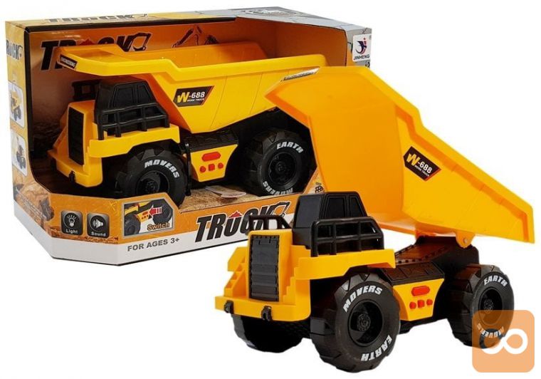 Izdelan je iz najkakovostnejše plastike, ki zagotavlja vzdržljivost in varnost med uporabo. Rumena in črna barva poskrbita, da je vozilo videti realistično. Avto se premika s pomočjo tornega pogona, samo potegnite voziček nazaj in uživajte v hitrosti. Na dnu prekucnika so 4 gumbi, s katerimi prekucnik oddaja zvok hupe, dviganje prekucnika, vzvratno vožnjo in drugo. Poleg tega ima svetlobne učinke, luči na sprednjem delu avtomobila svetijo. Zabava na gradbišču bo še bolj privlačna! Pesek, kamenje ali druge materiale lahko prevažamo na različna mesta.
