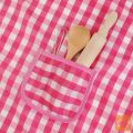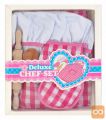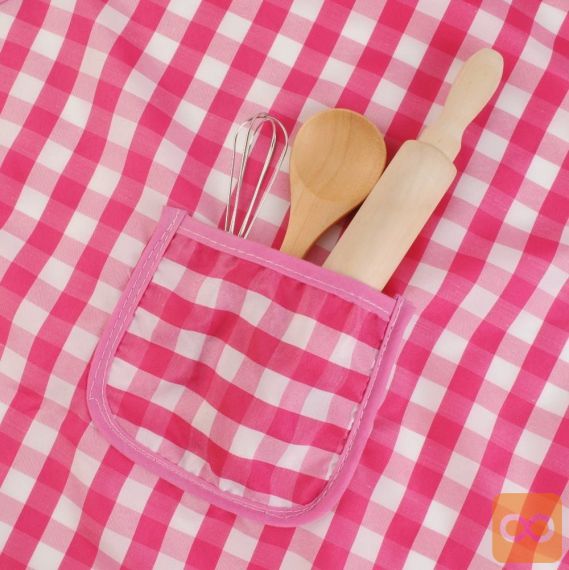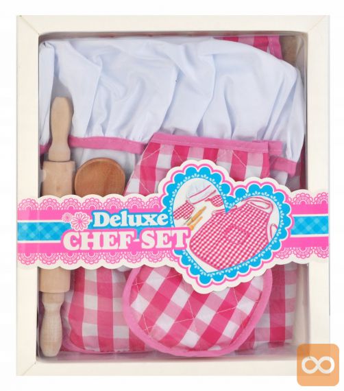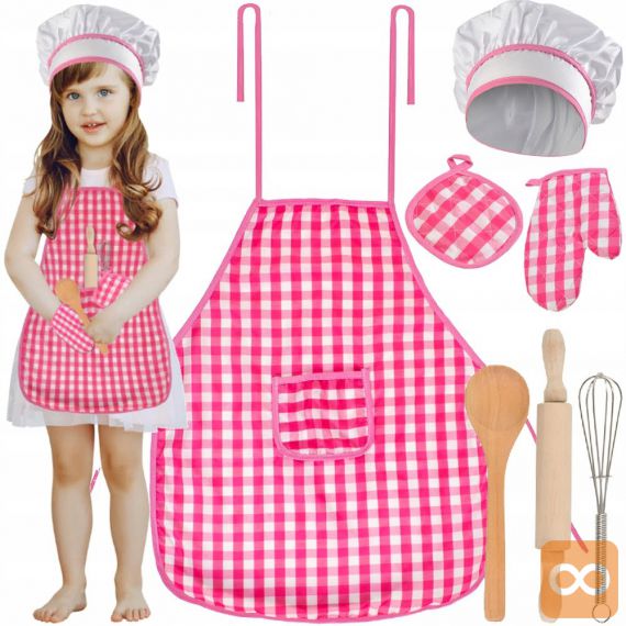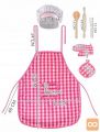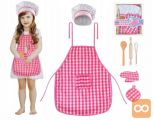 Set sestavljajo predpasnik, kuharska kapa in dodatni kuharski pripomočki, kot so: zaščitna rokavica, podloga za toplo posodo, leseni valjar in žlica ter kovinska metlica. Obleka je izdelana iz mehke tkanine, kar zagotovo poveča udobje njene uporabe. Lep kroj, estetski robovi, očarljiv karo vzorec in sladka roza ter bela barva naredijo izdelek vizualno privlačen. Material je varen in enostaven za čiščenje. Kostum je univerzalen in udoben zahvaljujoč vrvicam. Primerno za otroke različnih starosti in teže. Primeren bo tako za mlajše kot starejše otroke.