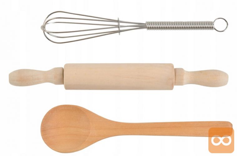 - DODATNI PRIPOMOČKI – priloženi artikli v obliki zaščitne rokavice, blazinice za toplo posodo, lesenega valjarja, žlice in kovinske metlice popestrijo zabavo, razvijajo kreativnost in spodbujajo otroško domišljijo.