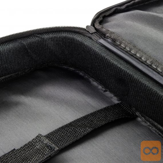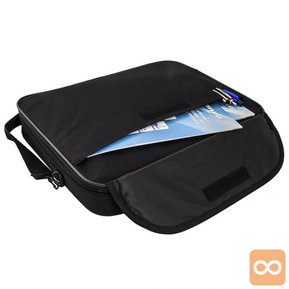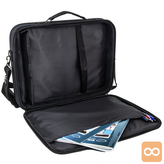 Elegantna torba za prenosnike z diagonalo max. 15,6 “. Velikost notranje komore se prilagaja s pomočjo drsnega traku z ježkom, ki omogoča prilagoditev komore dimenzijam prenosnika. Torba je izdelana iz visoko kakovostnega materiala. Stranske stene so ojačane s kovinskim trakom, notranjost pa je obložena z mehko plastjo pene, ki prenosnik učinkovito ščiti pred udarci in praskami. Predal za prenosnik na vsaki strani je obložen z mehkimi materiali. Na zunanji strani – spredaj – ima torba funkcionalen žep, npr. za dokumente. V notranjosti torbe je še drugi žep in trak, ki dodatno drži prenosnik. Kovinski tečaji ročaja in naramnice zagotavljajo visoko vzdržljivost in zanesljivost. Nastavljiv naramni trak je pritrjen z zelo praktičnimi kovinskimi karabini,