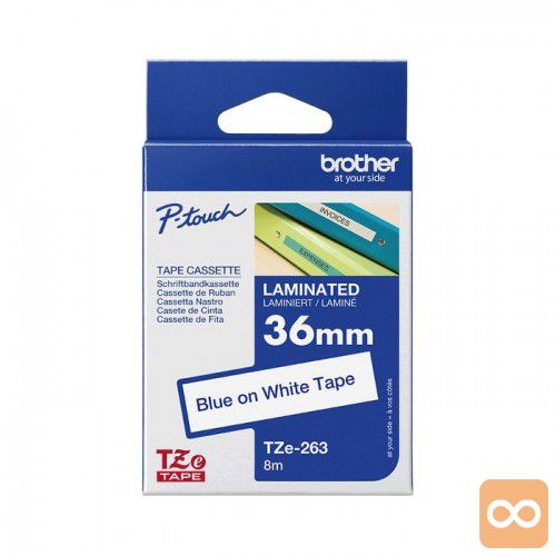 Trakovi > Trakovi za Brother (TZe / HSe), Originalni laminirani trak Brother TZE253 za vsestransko označevanje. Modra pisava na b...