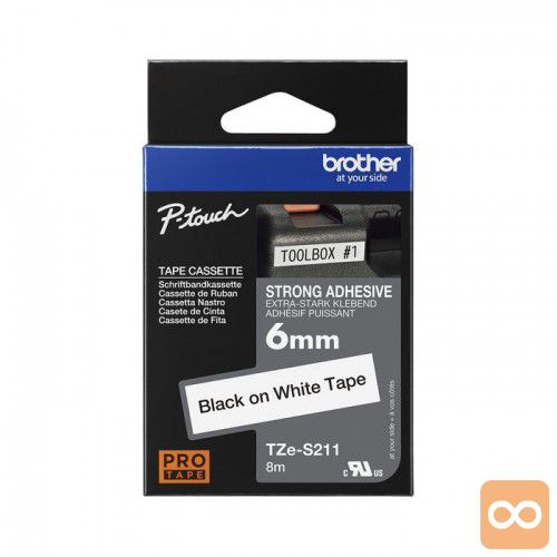 Laminirani trak Brother TZES211 z močnim lepilom za zahtevne in rahlo hrapave površine. Črna pisava na belem traku širine 6 mm. Dolžina kasete: 8 m. Odporen na vodo, UV, temperaturo, kemikalije in praskanje.