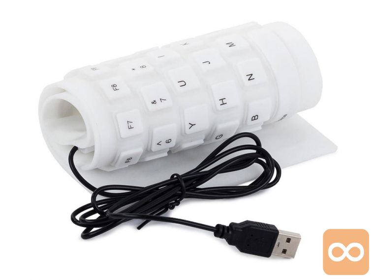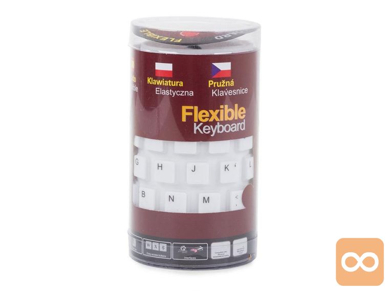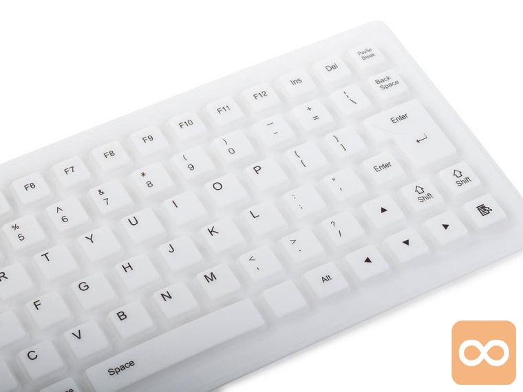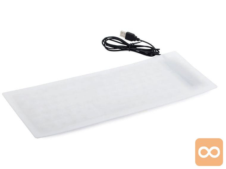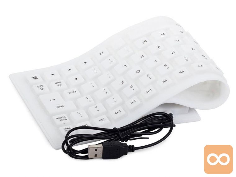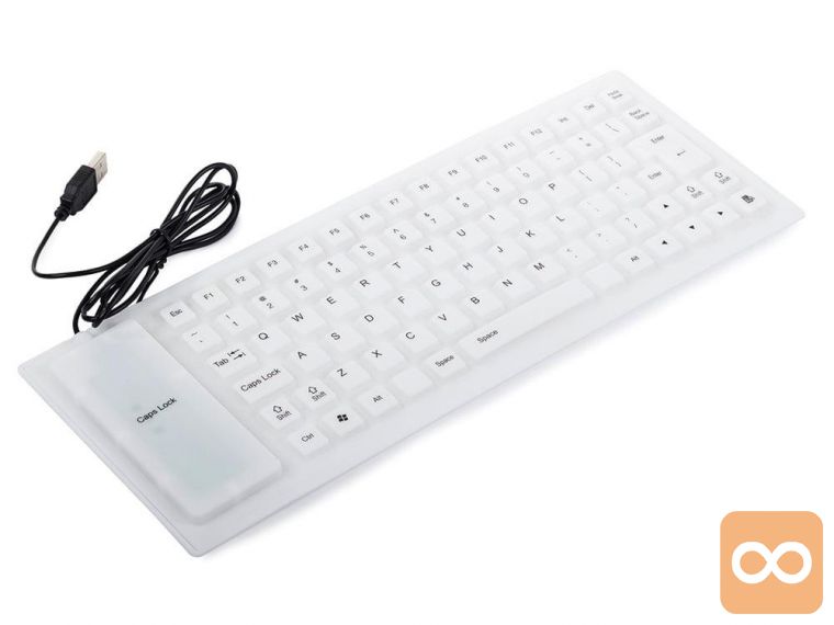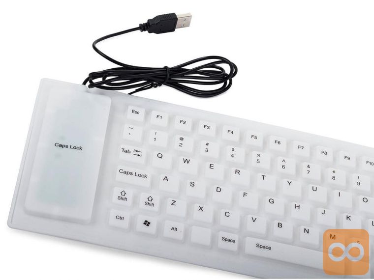 Popolnoma nova silikonska upogljiva tipkovnica standardne velikosti. Je odličen, izjemno praktičen in predvsem vodotesen izum. Silikonska tipkovnica je tudi odporna na vodo in prah ter zaradi svoje zasnove popolnoma tiha. Posebno nedrseče dno preprečuje premikanje tipkovnice med uporabo.