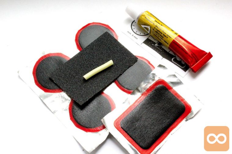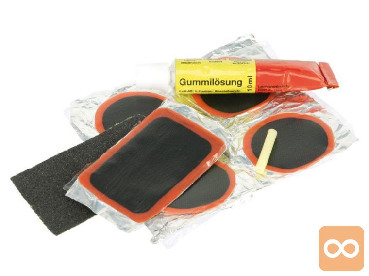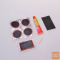 Praktični komplet za popravilo z brusnim papirjem za hrapavljenje območja popravila, 1 tubo raztopine gume, 1 cevjo ventila in 5 obližev za popravilo.