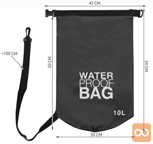 Torba je izdelana iz trpežnega materiala, ki ni le vodoodporen, ampak tudi učinkovito ščiti predmete v notranjosti pred praskami in umazanijo. zaradi umazanije, peska ali soli . Črna barva in gladka, spolzka površina ne vpijata vlage ali umazanije, zato je popolna tudi pri ekstremni, intenzivni uporabi, zagotavlja pa tudi enostavno čiščenje. Izdelek je trden in uporaben večkrat v daljšem časovnem obdobju . 10-litrska torba vam omogoča, da vanjo shranite številne uporabne in dragocene predmete, kot so telefon, denarnica, oblačila, čevlji, knjige, zemljevidi, fotoaparat, elektronska oprema ali druge stvari, odvisno od potreb posameznika.