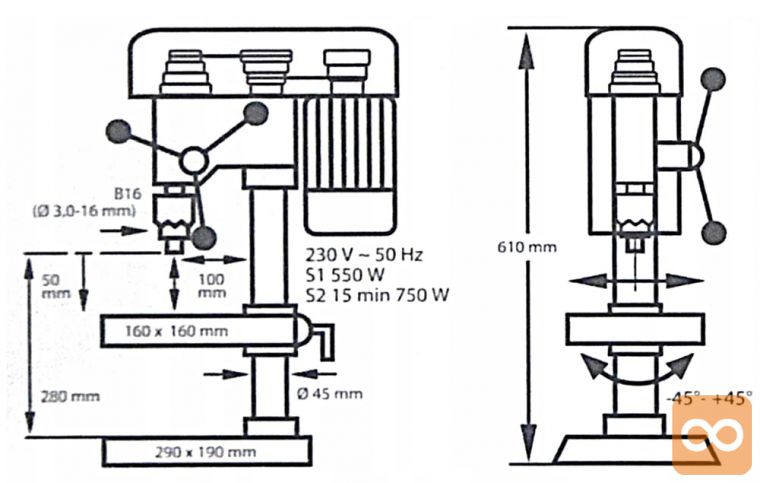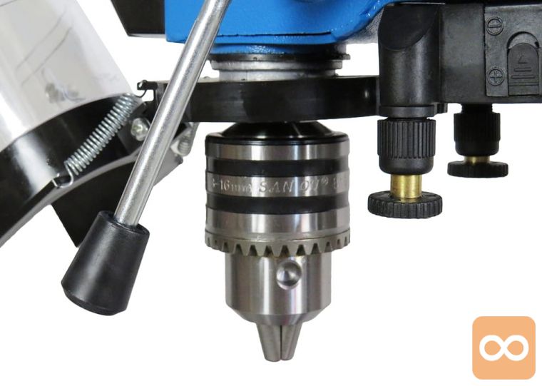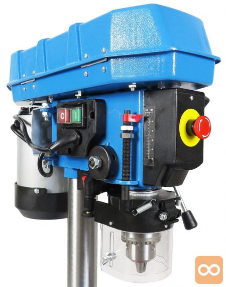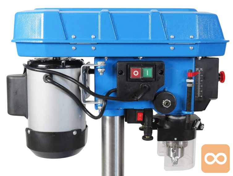 - Stebrični vrtalnik, ki ga poganja klinasti jermen in je opremljen z zmogljivim indukcijskim motorjem 750 W, ki zagotavlja optimalne delovne parametre.