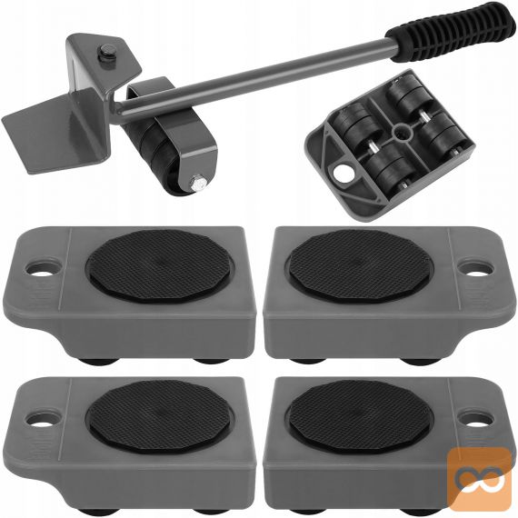 - 5v1 – komplet vključuje celoten komplet za transport pohištva. 4 podstavki z 8 kolesci z ročico na 4 kolesih. Z uporabo kompleta lahko premaknete utež do 150 kg.