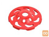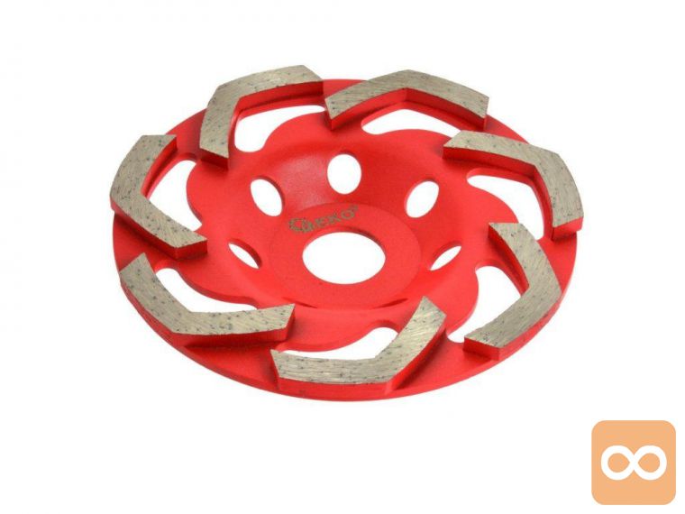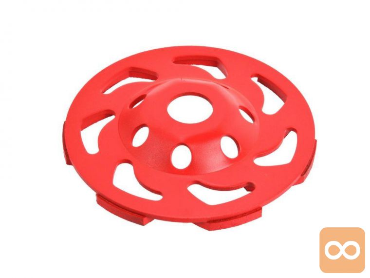 Diamantna plošča v obliki črke L za brušenje trdih gradbenih materialov. Ima izjemno visoko koncentracijo visokokakovostnega diamanta. Disk zagotavlja visokokakovostno brušenje med celotnim delovanjem. Te lastnosti izboljšajo kakovost brušenja in življenjsko dobo diska. Uporaba hladilnih lukenj bistveno podaljša življenjsko dobo diska. Sodobni postopki toplotne obdelave in posebna površinska obdelava zmanjšujejo obrabo diska in povečujejo vzdržljivost. V kompletu je O-tesnilo za zmanjšanje notranjega premera. Plošča je idealna za: odstranjevanje oblikovnih nepravilnosti in brušenje velikih površin: granita, marmorja, opeke, klinkerja, naravnega in umetnega kamna, armiranega betona, tlakovcev. Zasnovan za suho delovanje.