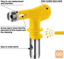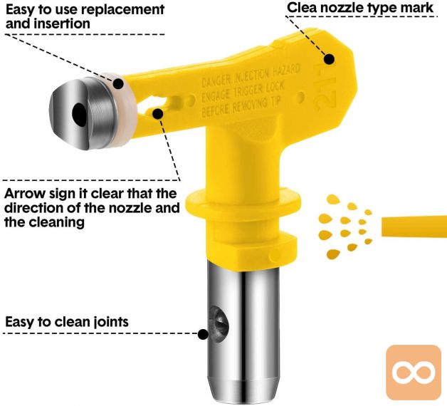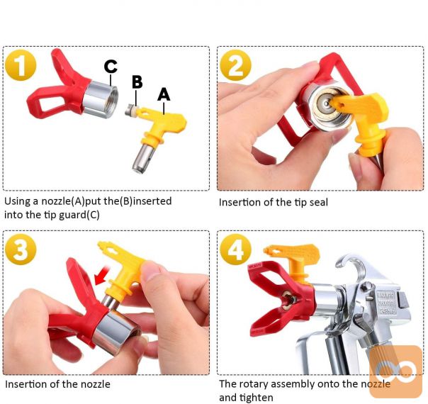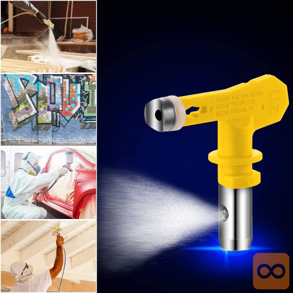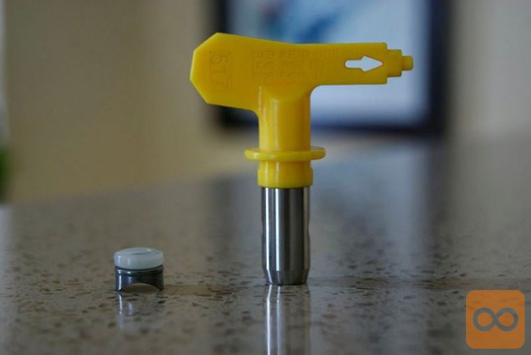 • Enostavna Namestitev in Odstranitev: Šobe se enostavno namestijo na airless pištolo in prav tako enostavno odstranijo za čiščenje ali zamenjavo.