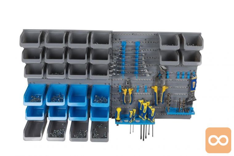 Ne glede na to, ali je v servisni delavnici ali zasebni garaži: ta večnamenski regal, ki ga sestavlja 24 košev, je idealna rešitev za vzdrževanje urejenosti delovnega mesta.