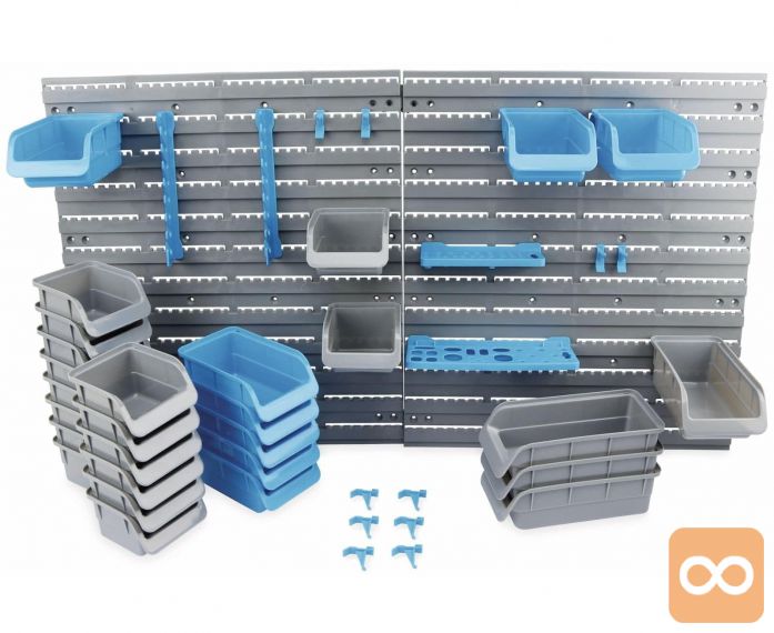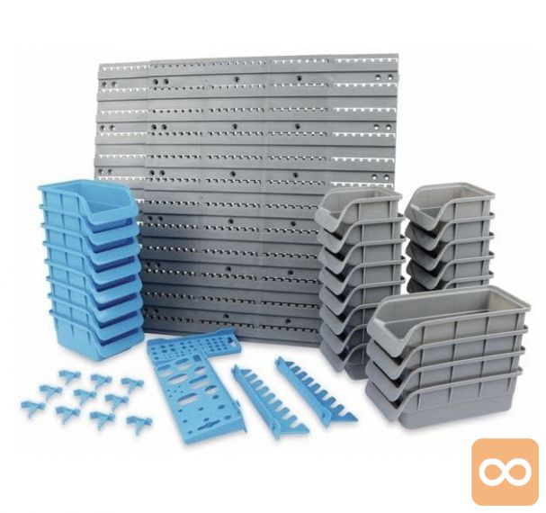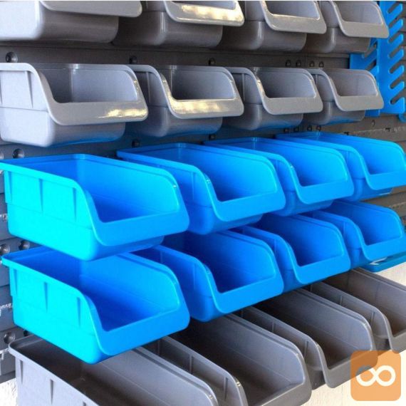Praktične škatle za zlaganje iz plastike, odporne na udarce, za shranjevanje majhnih delov, kot so vijaki, gumbi itd. Dobavljene z ustreznimi obešalnimi vodili.