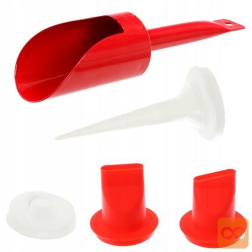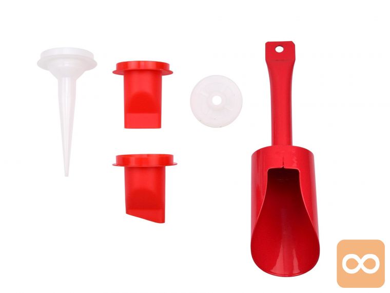 • komplet vsebuje tri vrste konic, rezervni bat in posebno profilirano lopatko za nanos mase