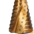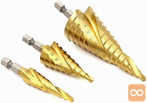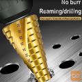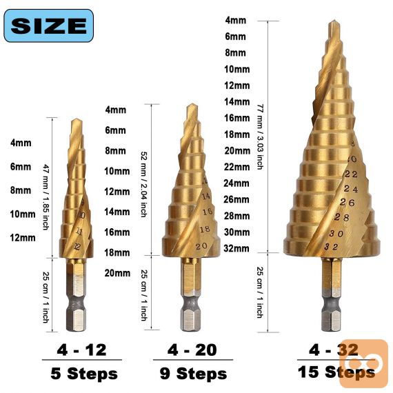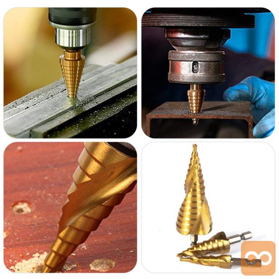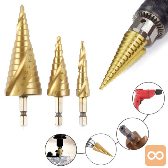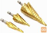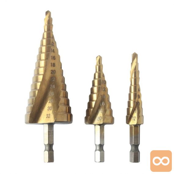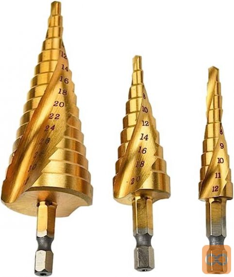 Set spiralnih stopničastih svedrov za kovino iz HSS jekla, prevlečenih s titanom.