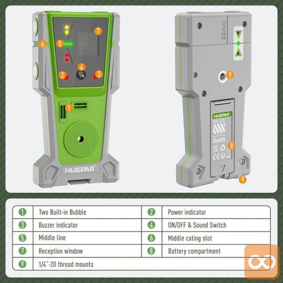 • Priporočljivo ga je uporabljati skupaj z laserskimi nivelirji Huepar 902CG/901CG/8211G/BOX-1G/R/GF360G/R/HM03CG/S03CG/S04CG/S03DG/LS04CG/LS03CG/LS41G/621C/R/603CG/R/B serije P itd.