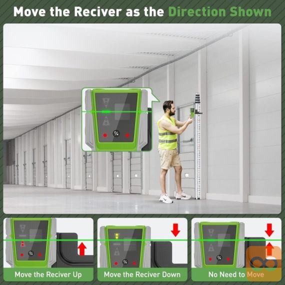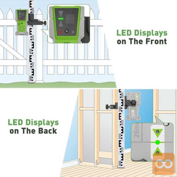 • Natančnost: Visoka natančnost ±1,5 mm; uporabniku preprosto naroči, naj laser namesti višje ali nižje na nagibni palici. To zagotavlja natančno odčitavanje nivoja ves čas.