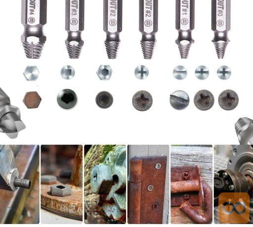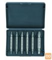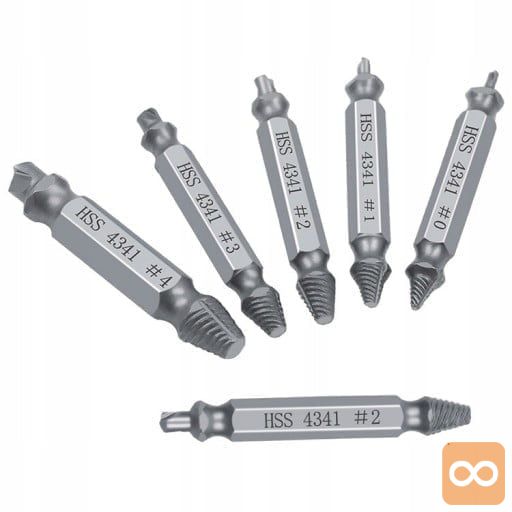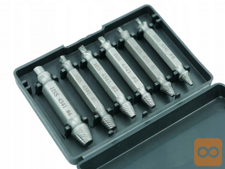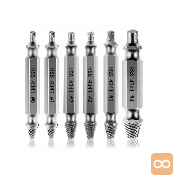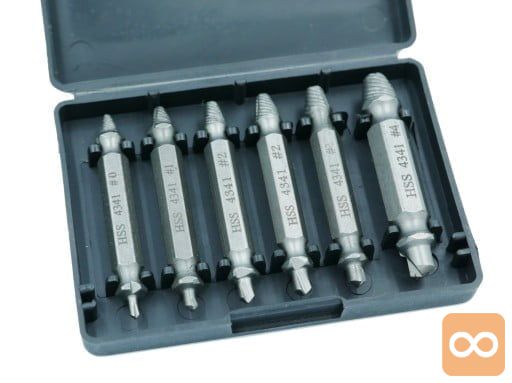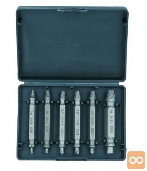 V kompletu je 6 kosov izvlečkov za polomljene vijake. Set je sestavljen iz ekstraktorjev z najbolj priljubljenimi premeri, zaradi česar je nenadomestljiv v vsaki delavnici ali garaži. Uporablja se za odstranjevanje zlomljenih, poškodovanih vijakov, ki nimajo elementov, ki bi omogočali njihovo odvijanje.